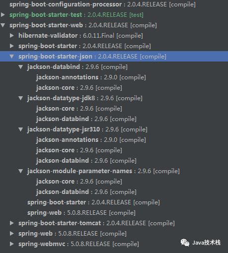 除了Spring Boot必須自帶的parent依賴外,僅僅只需要加入這個 spring-boot-starter-web 包即可,它會自動包含所有JSON處理的包,如下圖所示。